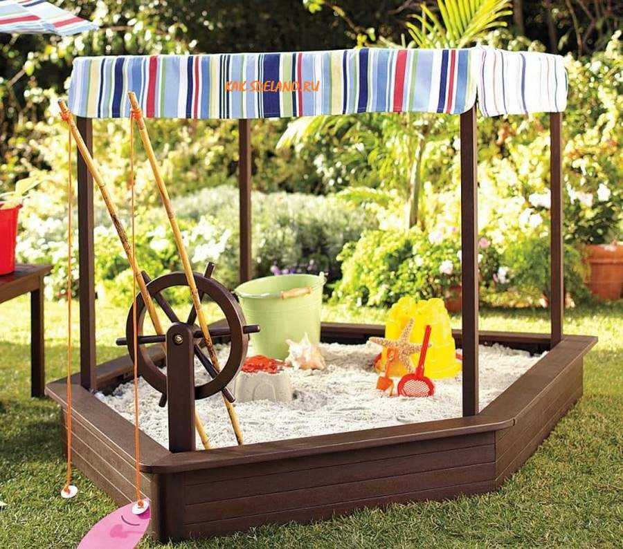 В такой песочнице можно будет не только строить замки, но и играть в пиратов. А «парус» дополнительно защитит от палящего солнца. Оригинально, не правда ли?