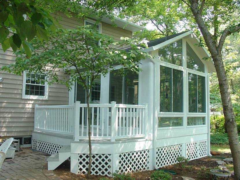 Наиболее частым вариантом пристраивания помещений к жилому строению является строительство крытой веранды. Быстро и качественно можно сделать пристройку к дому из каркаса. Легкая постройка не требует мощного фундамента. Окна делают распашными или закрытыми.