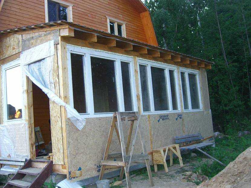 Простой и сравнительно недорогой вариант каркасной пристройки к деревянному дому – остекленная верандаИсточник pingru.ru