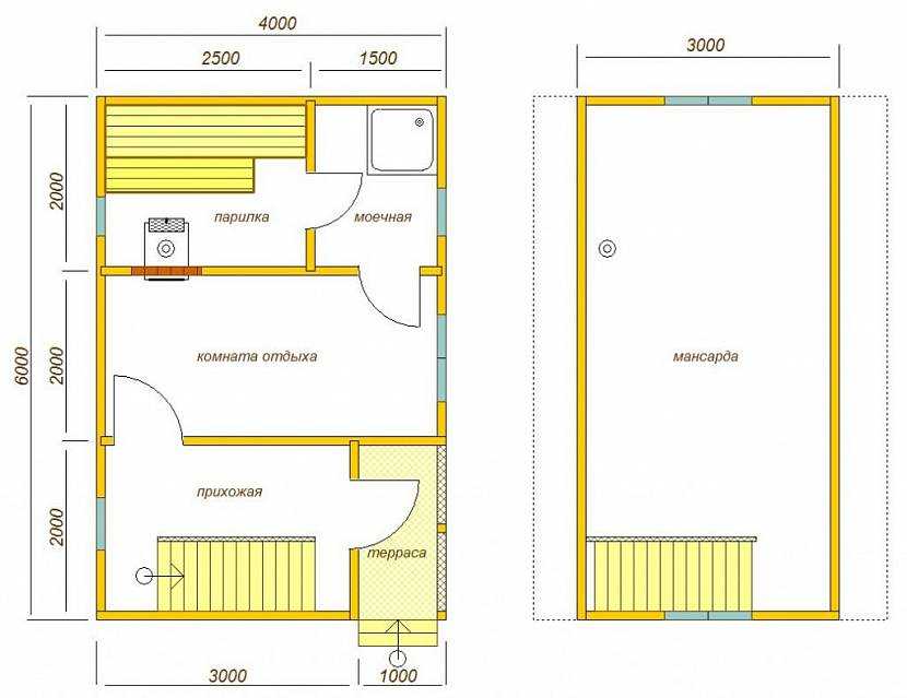 Самая удобная лестница для бани-домика – поворотная с забежными ступенями. Мансарду же разделите минимум на две отдельные комнаты – хотя бы холл и гостевую спальню.