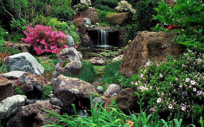 Камни – это главный элемент сооружения. Располагать их необходимо в один слой, стараясь эффектно сочетать грубые формы валунов и отшлифованную мелкую гальку. Сначала необходимо выкладывать крупные глыбы, укрепляя их снизу гравием или щебнем.