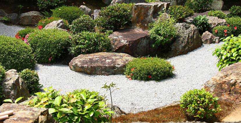 Сад из камней хорошо гармонирует с водопадом или прудом. Для украшения можно также использовать глиняные фигуры.