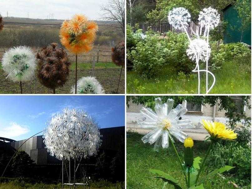 Одуванчики делают по-разному. Белые одуванчики можно изготовить из бутылок того же цвета. Для этого удобно использовать верхние части тары, вырезанные в виде острых лепестков. Каждая деталь крепится на проволоке одинаковой длины к общему центру. Получается легкий белый шар.