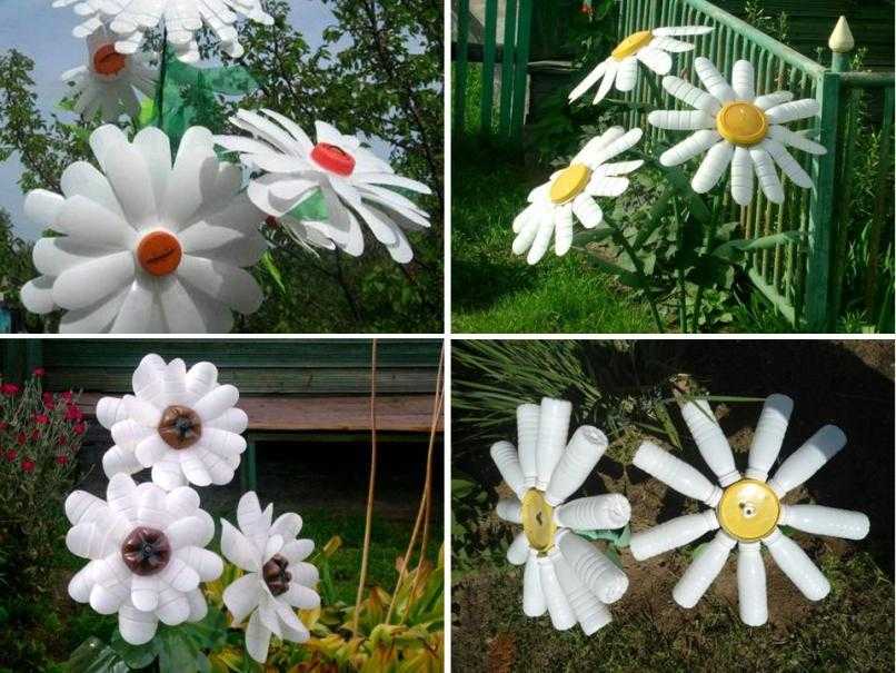 Конечно, в первую очередь, хочется сделать ромашки для клумбы. Их можно изготовить из частей или целых бутылок белого цвета. В качестве сердцевины подойдет крышка желтого цвета или донышко от коричневой емкости. Листья растений можно изготовить из зеленой тары. Стебли могут быть из проволоки, трубы, арматуры или дерева. Последние следует покрасить зеленой краской.