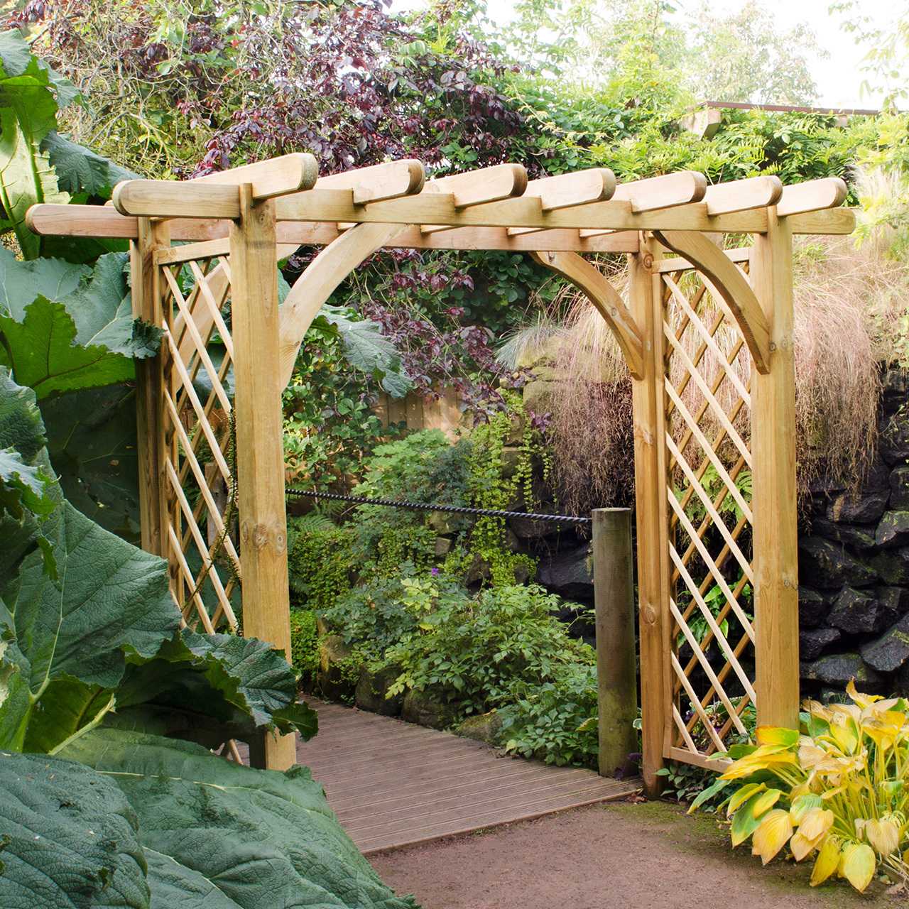 Часто боковые поверхности сооружения делают в виде решетки, чтобы лианы могли цепляться за перекладины и стойки. Для удобства прохода под перекрытием сооружение делают высотой от 2 м. Между опорами оставляют 120 см или больше свободного пространства, чтобы вьющаяся растительность нормально разрасталась без затенения. Оформление декоративного элемента выбирают в соответствии со стилем участка.
