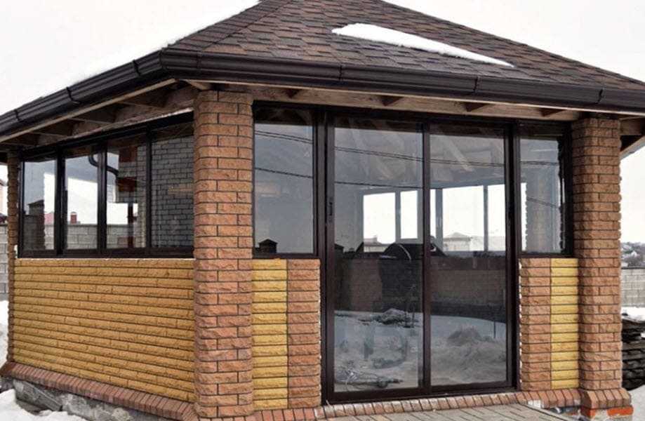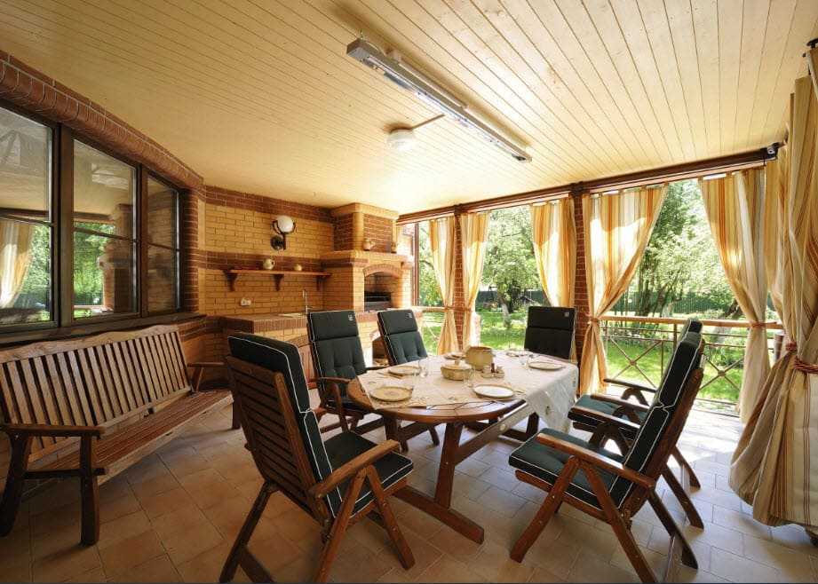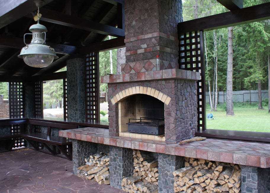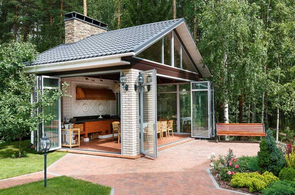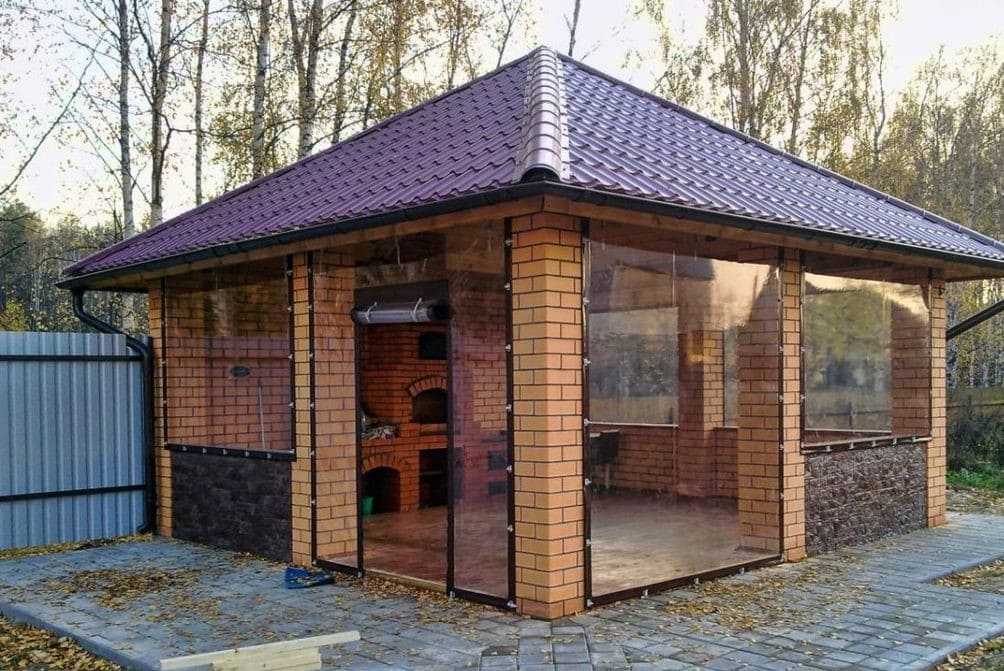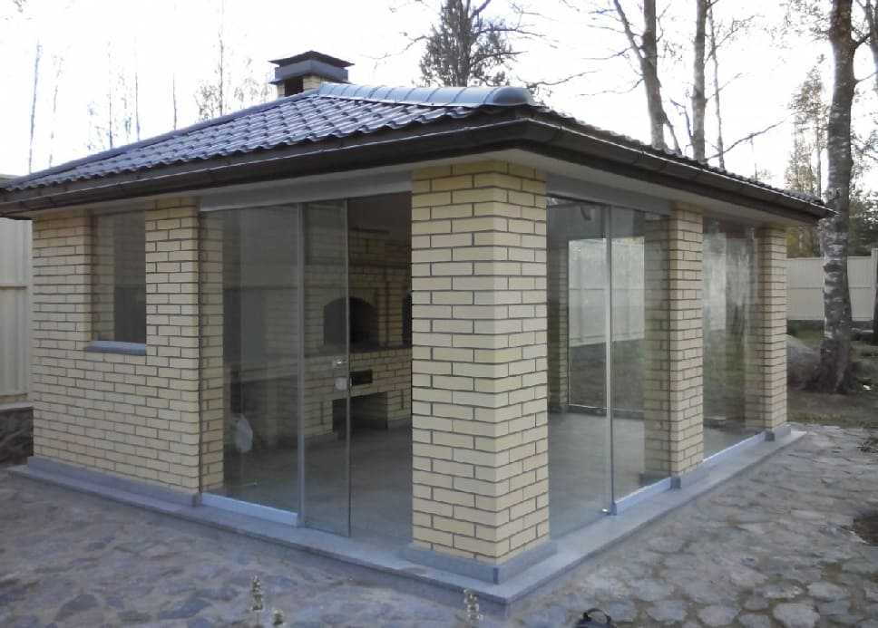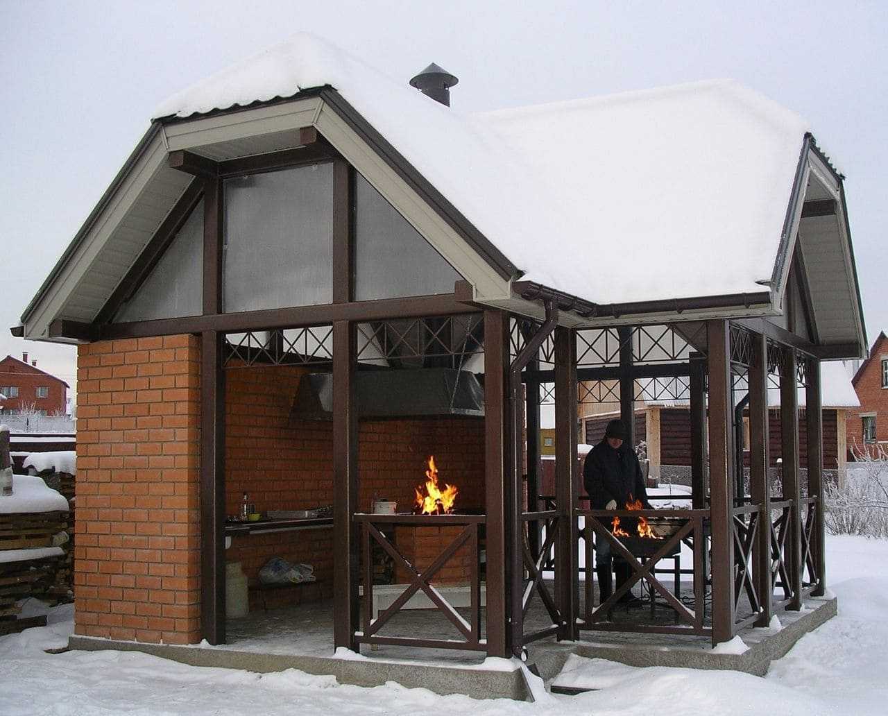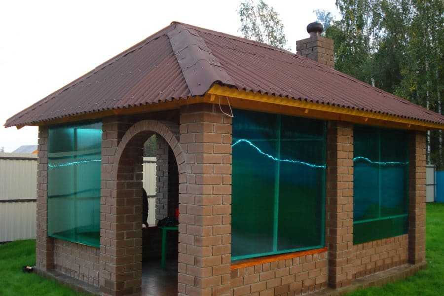Финальный этап – установка крыши, лучше всего отдать предпочтение односкатной или двускатной конструкции. Что касается выбора кровельных материалов, то ограничений здесь нет, а единственный нюанс – это необходимость отверстия под дымоход, которое нужно тщательно изолировать оцинкованным железом. В качестве кровельного материала лучше всего смотрится металл, гибкая и керамическая черепица. Сделать беседку зимней можно, застеклив окна и утеплив стены, пол и потолок. Что касается напольного покрытия, то оно может остаться бетонным, выложенным из кирпича или тротуарной плитки.