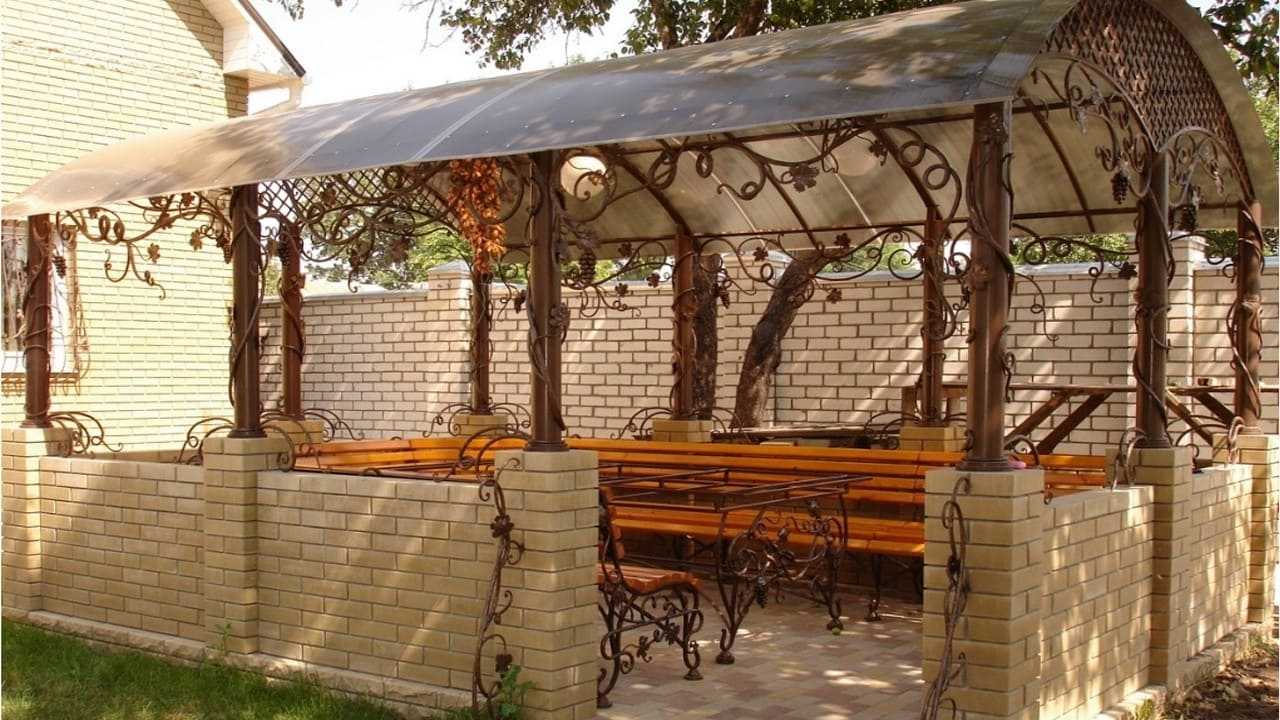 Кирпич и элементы ковки в беседке для летнего отдыхаИсточник yandex.uz