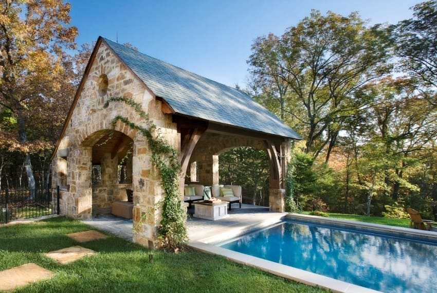 Незамысловатую садовую беседку можно соорудить из разнообразных подручных материалов, однако для построек, в которых будут размещены мангал, печь или барбекю, дизайнеры предпочитают использовать следующие материалы.