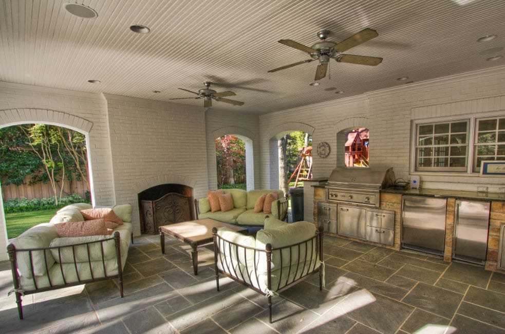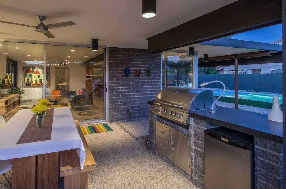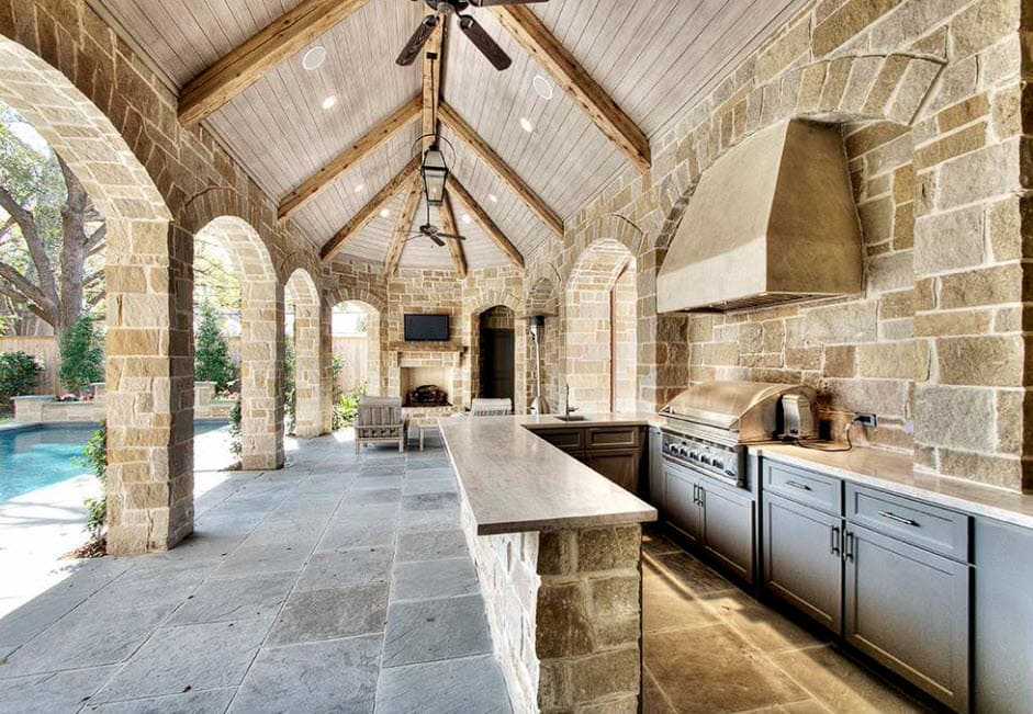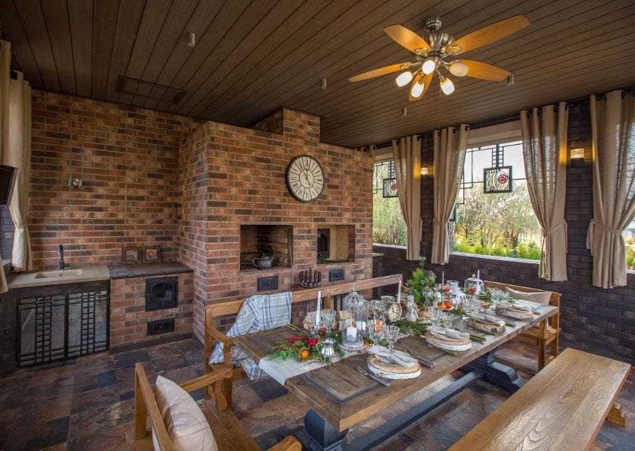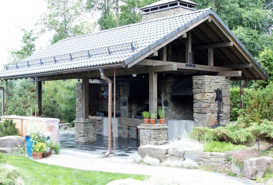 Рекомендуется использовать негорючие материалы. Лучше сделать одну или две сплошные стены, сведя к минимуму сквозняки, что сделает место для еды под открытым небом более комфортным и «домашним». Когда сооружение будет готово, рекомендуется подвести туда ветку водопровода и электропровод.