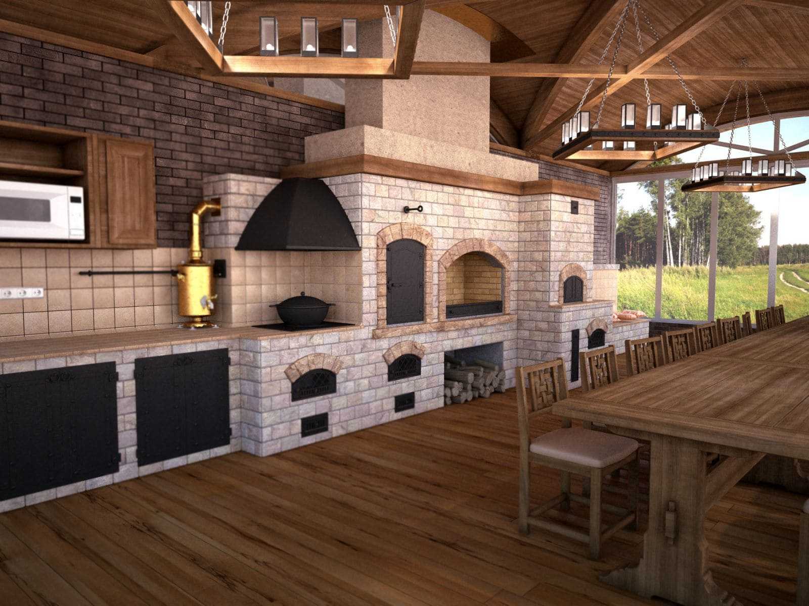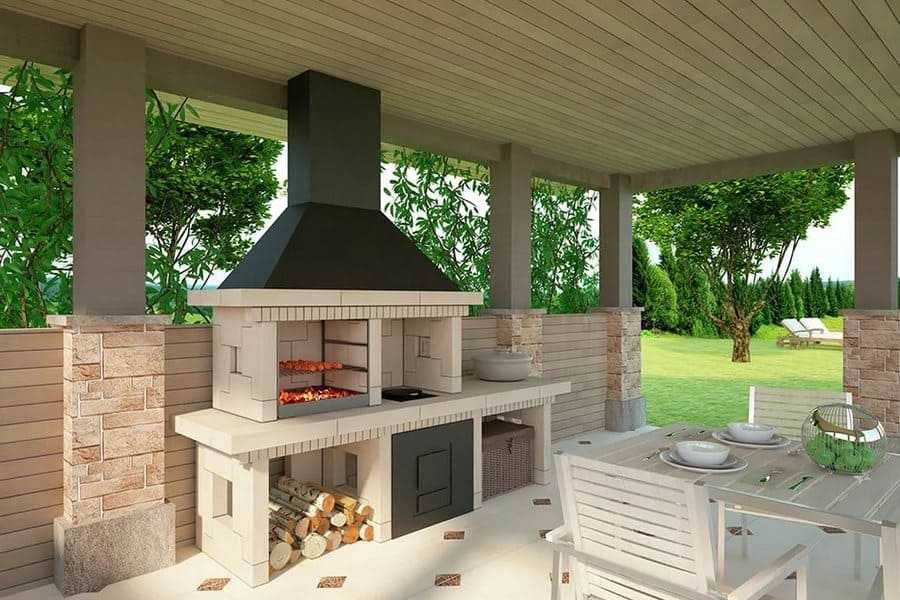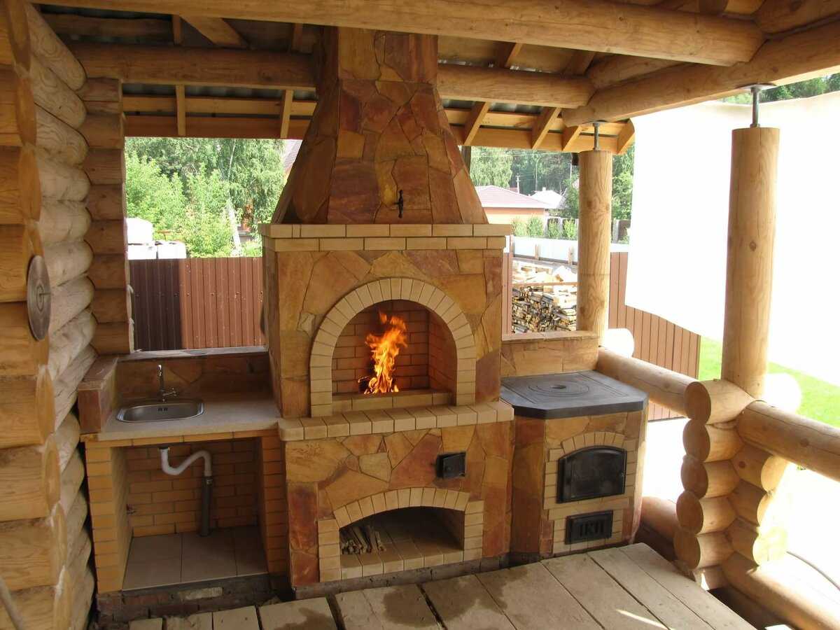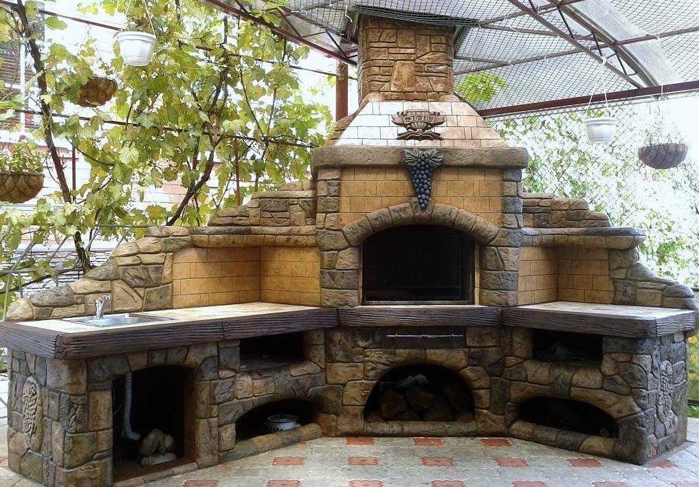 Проект печи нужно проработать отдельно, так как любая неточность влияет на качество работы. Конструкция может иметь одну или несколько топок, рабочую и разделочную поверхность, мойку и шкаф для хранения посуды. В верхней части конструкция должна переходить в трубу, дымоход располагается выше уровня кровли, сверху его закрывают металлическим «зонтиком», защищающим пространство от осадков. Следующий шаг – подведение необходимых коммуникаций и отделка поверхности очага керамикой или штукатуркой.