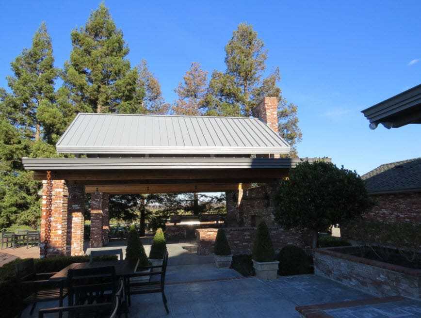 После выполнения всех этих работ, приступают к покрытию кровельного материала. В целях безопасности, обычно в беседках для дачи с мангалом (фото тому в подтверждение) используют металлочерепицу или профнастил. Но при правильном проведении всех работ, для таких беседок подойдет гибкая черепица или поликарбонат.