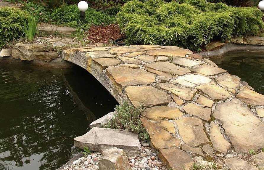 Природный камень имеет большой вес. Для облегчения конструкции можно использовать металлический каркас, заполненный искусственным камнем. Для придания прямому мостику декоративности перила делают низкими (40 сантиметров) или устанавливают их с одной стороны. Подвесные конструкции располагают над ручьями, небольшими прудами. Все мостики через водную преграду надо размещать в самом узком месте. Высокие арочные сооружения могут служить для обзора ландшафта. При расположении рядом с цветником мостик может стать его продолжением, если на нем разместить горшки с растениями.