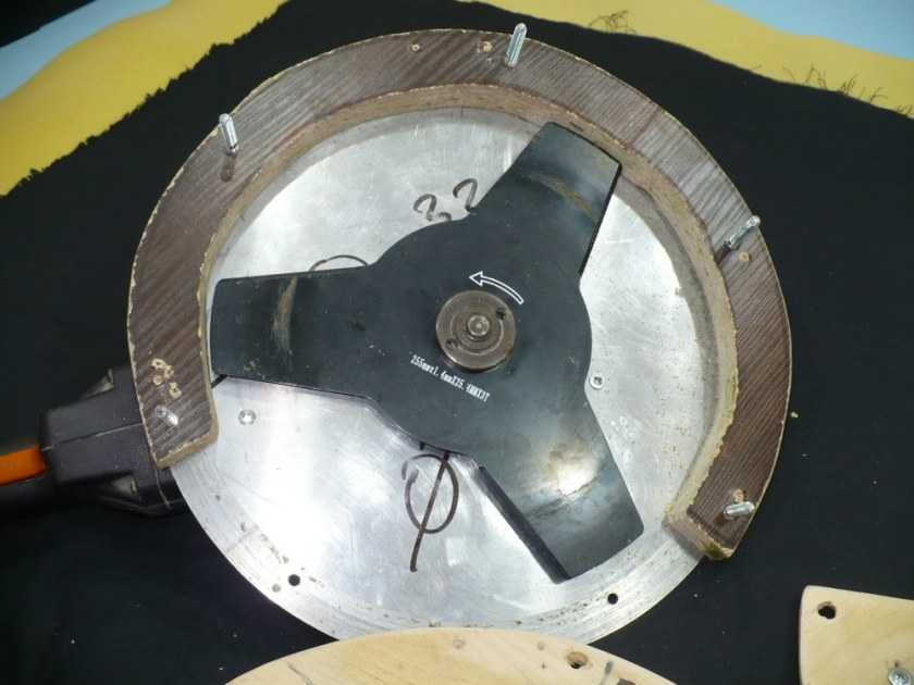 Ведро надевается на шпиндель, а за ним и нож. Неплохой нож — это косильный резак. С ним могут быть проблемы, так как шпиндель болгарки М14, а посадка должна быть тугой. Гайку обязательно затягивать ключиком, а не руками.