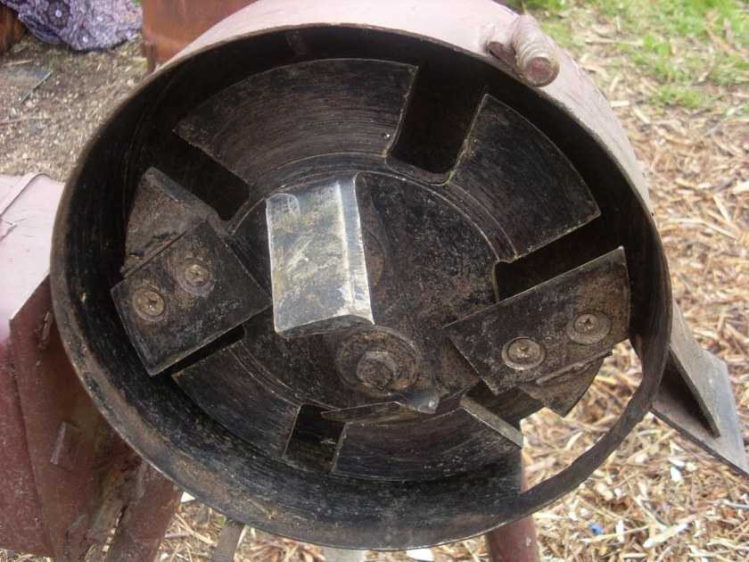 - С помощью токарного станка необходимо выточить втулку, которую размещают в нижней части бункера, к ней прикрепляются заранее изготовленные ножи. Материал для измельчения подается с верхней части, а переработанное сырье уходит через отверстие с боковой стороны устройства.