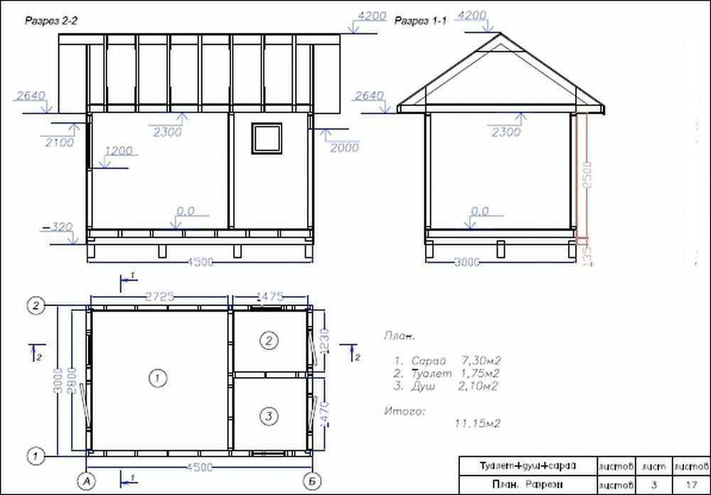 Чертежи наносят на бумагу с необходимыми размерами, соответствующими вашему выбору. Если дачный участок располагает ведению с/х хозяйства большой площадью, на нем вполне возможно построить хозблок для хранения инвентаря и огородных принадлежностей. В таком случае, вам понадобиться хозяйственный блок, совмещенный с кладовой (фото 1). Чтобы построить хозблок с туалетом и душевой, следует использовать это чертеж ( фото 2).