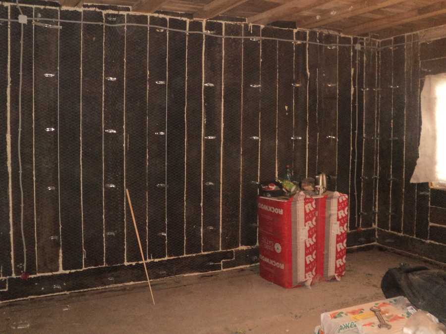 Нижний ряд шпал нужно обработать битумом для гидроизоляции, а поверху первого рядя уложить рулонный рубероид в два слоя. Это защитит стены от высокой влажности.
