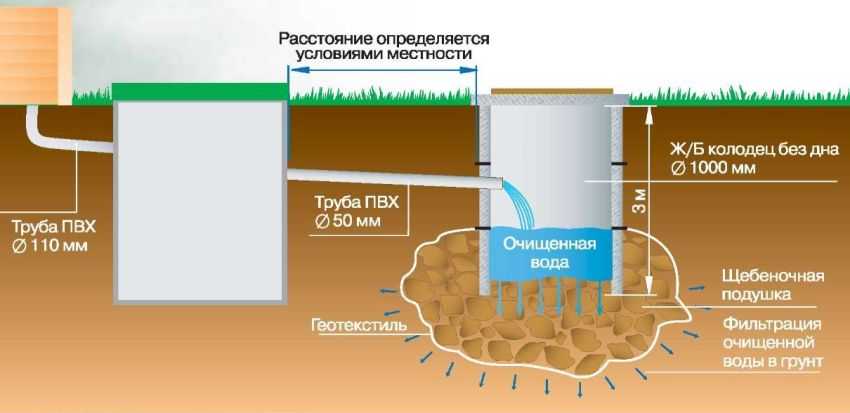 Схема сливной ямы с фильтрующим дном. Воздухозаборник выводится как можно выше, чтобы неприятный запах, характерный для канализационных накопительных емкостей не нарушал комфортное проживание