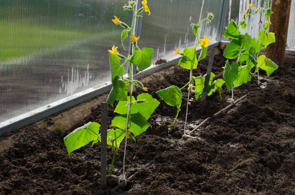 Огурцы в теплице из поликарбоната растут очень хорошо, их можно посеять прямо в грунт в середине весны, так они дадут ранний урожай. Шпалеры для закрытого помещения отличаются от конструкций для открытого грунта. Обычно это просто натянутые веревки, идущие от грядки до потолка.