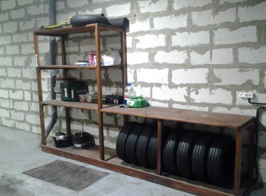 Деревянный стеллаж в гараж имеет аккуратный внешний вид.