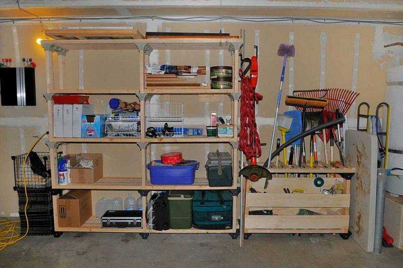 Стеллажи можно сделать более устойчивыми, закрепив их к стене или сделать мобильными, установив колесики на ножки стеллажа. Конструкцию на колесиках можно перемещать по гаражу, но для этого необходимо иметь ровный пол.