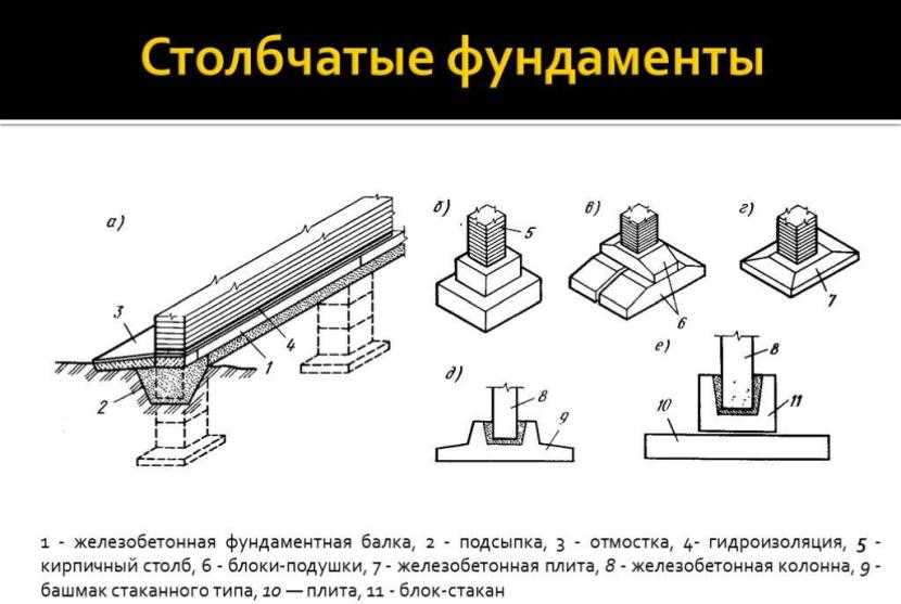 Типы столбчатых фундаментов: а. кирпичный столб на бутовом основании; б. сплошной кирпичный столб; в. кирпичный столб на бетонном основании; г. деревянный обожженный стул (дубовый или сосновый); д. стойка металлическая; е. бутовый столб.