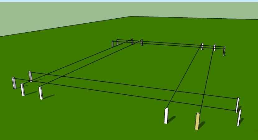 Правильность углов обязательно проверяется измерением диагоналей. На планках закрепляют верёвку, которой очерчивают границы здания и местоположение опор.
