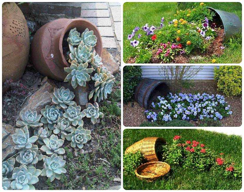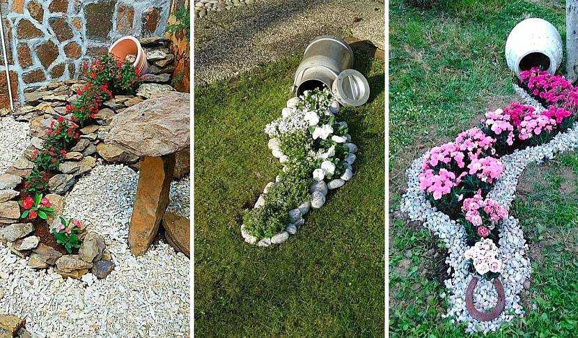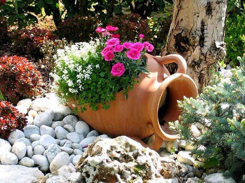 - Можно высаживать весной рядом 2-3 «ручья» рядом из растений, которые цветут в разное время. И перемещать или поворачивать емкость таким образом, чтобы всегда создавалась видимость цветочного ручья.
