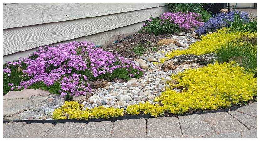 Естественный цветущий ковер по краям сухого ручья можно получить, используя на участке почвопокровные и травянистые растения. Среди красивоцветущих, лучше всего выбирать виды с сочно синими, фиолетовыми и голубыми оттенками цветов. Не оставят ручей безликим и ранней весной, и поздним летом, такие многолетники как колокольчик портеншлага, бруннера крупнолистная (незабудочник), флокс шиловидный, живучка ползучая, обриета дельовидная, лобелия, мускари, бадан толстолистный, мшанка, примула, голубая астильба, водосбор, барвинок, серебристый ландыш, гейхера, ирис сибирский и др.