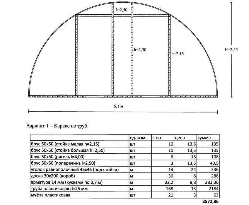 Расчет материалов для теплицы. Длина сооружения – 12 м, ширина – 5,1 м, высота – 2,55 м. Расчетное расстояние между дугами – 60 см. Длина дуги (трубы) 3,14 х R = 3,14 х 2,55 м = 8 м