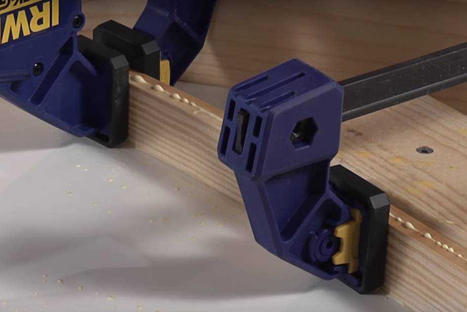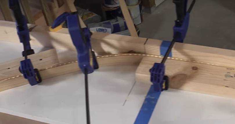 Шаг 5. Если дуга изготавливается без промежуточных брусков, уложите еще одну, третью доску, аккуратно сгибая ее. Скрепите с двумя предыдущими.