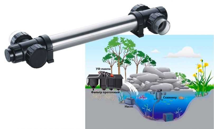 Как почистить водоем с помощью источников ультрафиолетового излучения? Как правило, для этого применяют специальный ультрафиолетовый фильтр. Выглядит он как сосуд, внутри которого размещена лампа. Его можно дополнить и обычным фильтром, сделанным своими руками.
