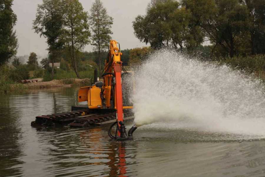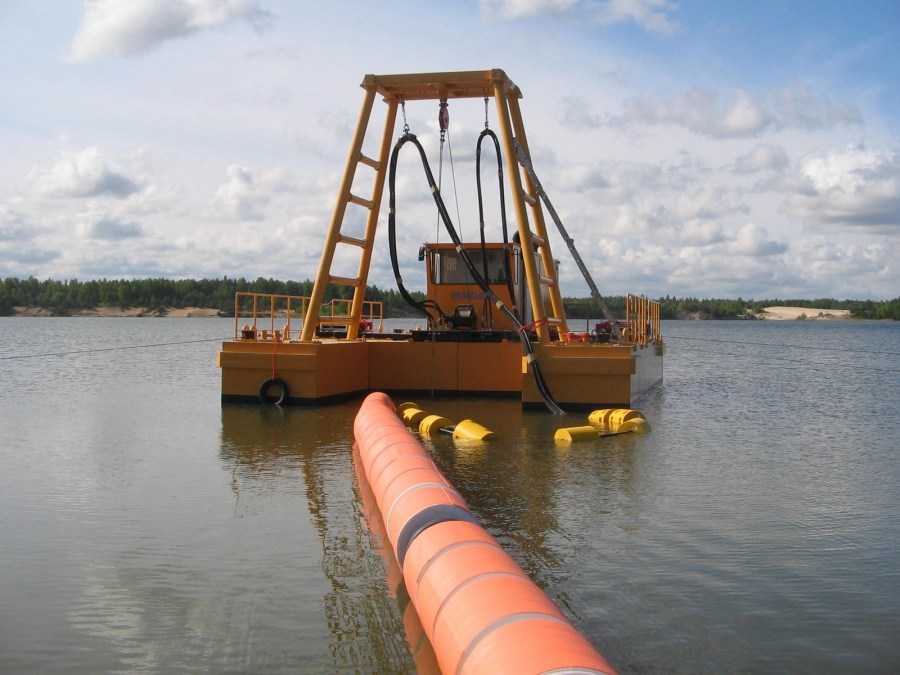 Чаще всего для проведения таких работ применяется специализированная установка – земснаряд. Она представляет собой систему насосов, приводимых в действие бензиновыми двигателями. Это универсальное устройство, позволяющее не только очищать дно от ила и удалять водоросли, но и углублять дно пруда и намывать грунт и песок для обустройства береговой зоны.