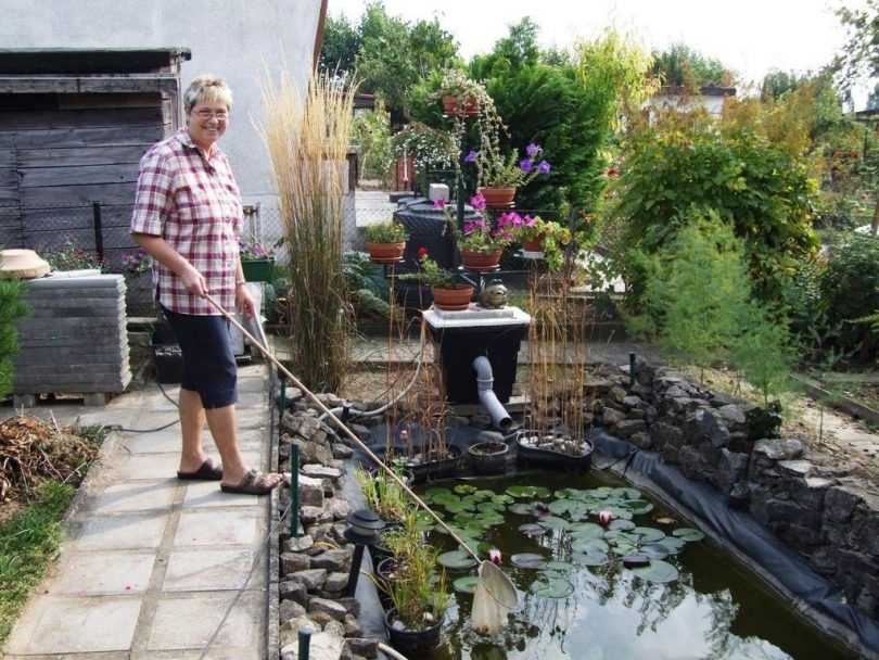 1. Периодически убирать из пруда упавшие листья, отмершие или слишком разросшиеся растения, всяческий мусор. Проще всего это делать специальным сачком с длинной ручкой. Если пренебречь этим правилом ухода, то органические остатки будут гнить в воде, образовывая слой тины, избавиться от которого будет намного сложнее.