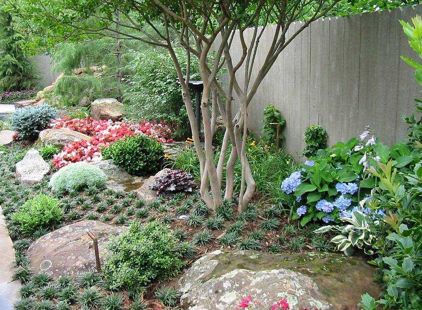 Не забудьте и про деревья с кустарниками. Они, кстати, могут послужить ширмой для неприглядного забора. А он будет у вас по всему периметру. Частично его можно будет украсить висячими клумбами, частично прикрыть деревьями-кустарниками. Пока деревья будут расти, можно поставить перед забором решетку, по которой пустить вьющиеся розы, клематисы, любое другое подобное растение.