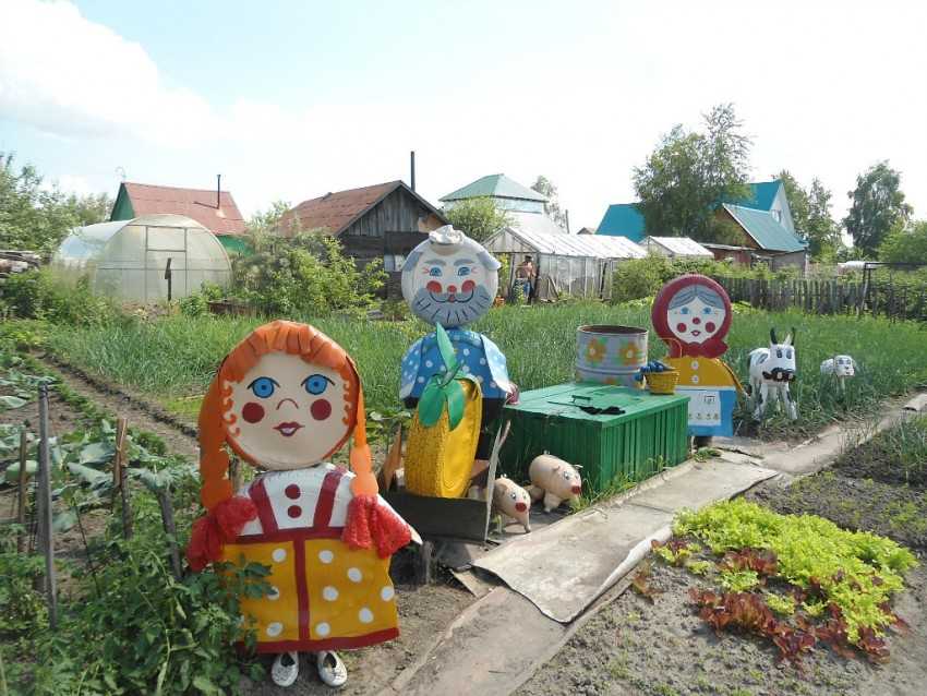 - эмоциональный садовый декор из дерева и металла, пластиковых бутылок, шин, веревок, кирпича, камней и других материалов.