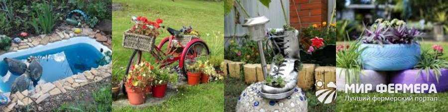 Для создания оригинальных клумб используют автомобильные покрышки и пластиковые бутылки, ведра и ненужные предметы мебели. Старый велосипед станет прекрасной подставкой для цветов, а банки с потеками краски прекрасно смотрятся в качестве подвазонников. Стулья без ножек легко превращаются в качели, а из детского конструктора можно соорудить яркий скворечник. В общем, идей множество. Предлагаем вашему вниманию некоторые задумки для создания садовых украшений.