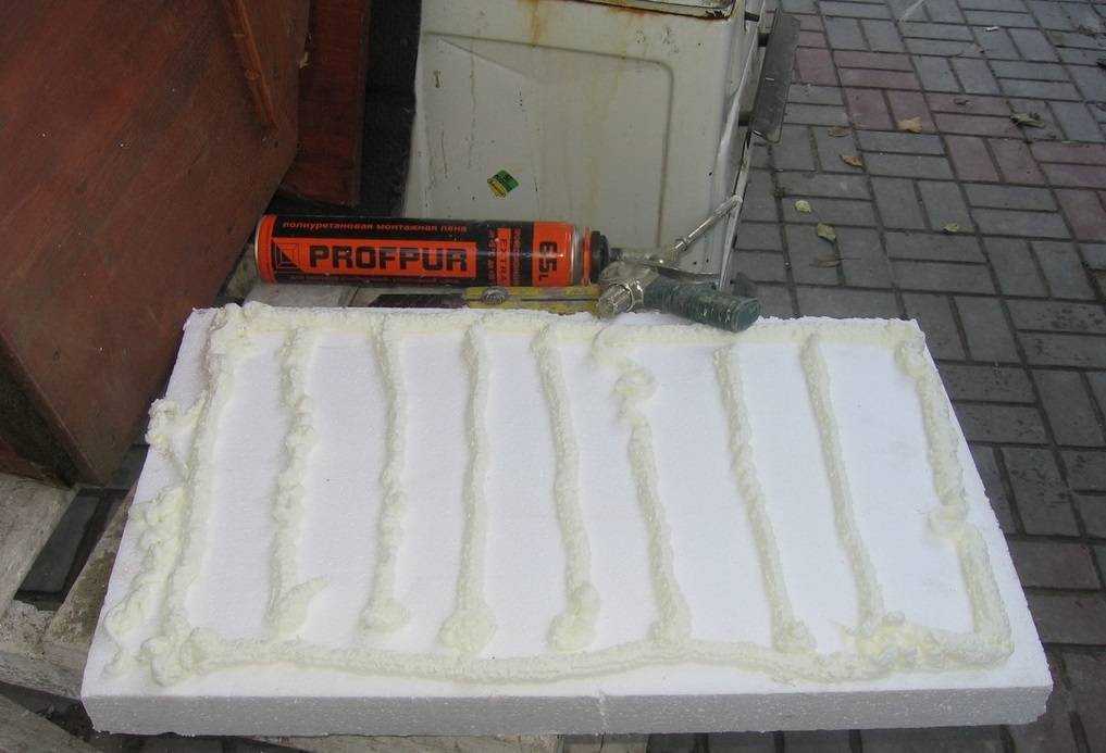 Монтировать листы пенопласта на внутренние поверхности можно с помощью клея для полистирола, монтажной пены или пластиковых дюбелей (для них понадобится понадобится обрешетка). Оптимальная толщина изоляционного слоя 50-100 мм. Стыки обязательно герметизируются монтажной пеной.