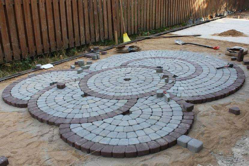 Круги. Такие примеры укладки тротуарной плитки осуществляются с применением разных узоров, деталей, форм и оттенков, которые выкладываются радиально. Здесь мастер может проявить фантазию и получить очень интересные результаты. Подходят для площадок различных размеров.