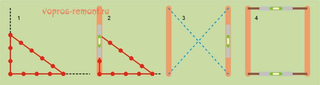 - Проверяем перпендикулярность «магическим треугольником», со сторонами 3:4:5 любых, но точно равных друг другу отрезков, поз. 1 на рис. «Магический треугольник» можно сделать из любого нерастяжимого шнура.