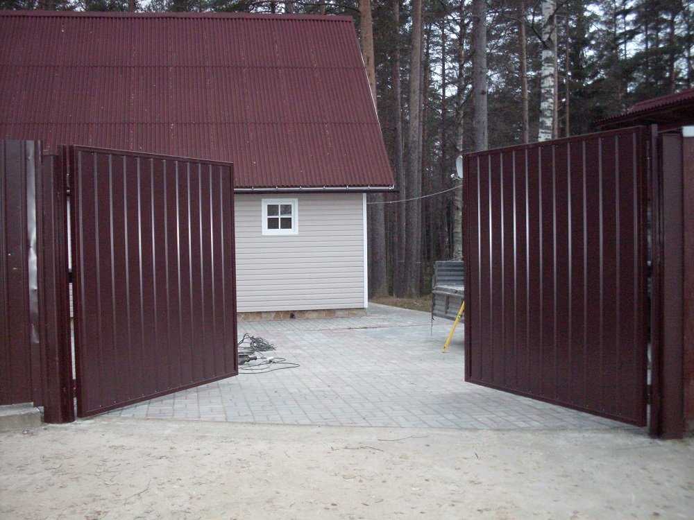 Ворота из профлиста, выполненные своими руками, можно установить на даче, на промышленной территории и на приусадебном участке. Это достаточно экономичная и долговечная разновидность ограждения. К тому же, широкая гамма выпускаемых расцветок позволяет выбрать наиболее подходящий вариант для любого участка.