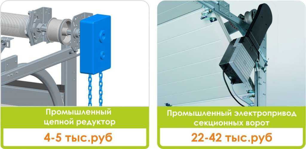 Зачастую на промышленные объекты дешевле и удобнее устанавливать цепной редуктор. Он доступнее (5 тыс. руб.), быстрее поднимает ворота, и редко ломается, по причине того, что ломаться там особо нечему. Например, для сервиса или мойки, цепной редуктор будет куда уместнее электропривода.