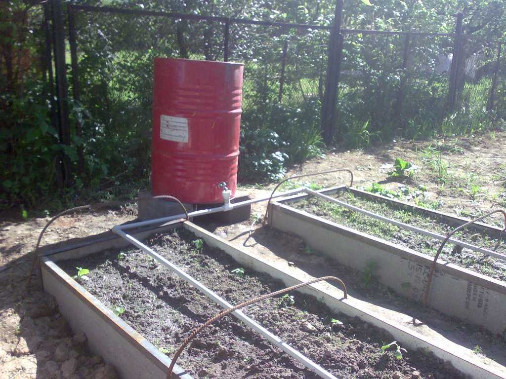 Самодельная система капельного полива из полимерных труб, источник воды — бочка