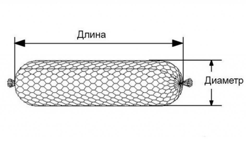 Другое название изделий – габионы-мешки. Они имеют цилиндрическую форму с защипнутыми по бокам остатками проволоки. Такой вид придает им схожесть с конфетой в обертке.