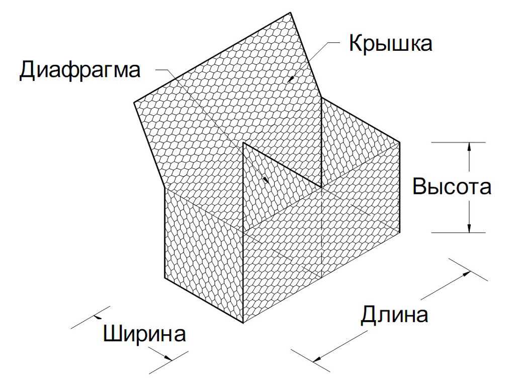 Конструкции в форме параллелепипеда с шириной до 2 м, высотой до 1 м. Длина может быть 2-6 м. Для продолговатых систем делают внутренние перегородки, они увеличивают прочность готового изделия. Изготавливают коробчатые габионы двумя способами: