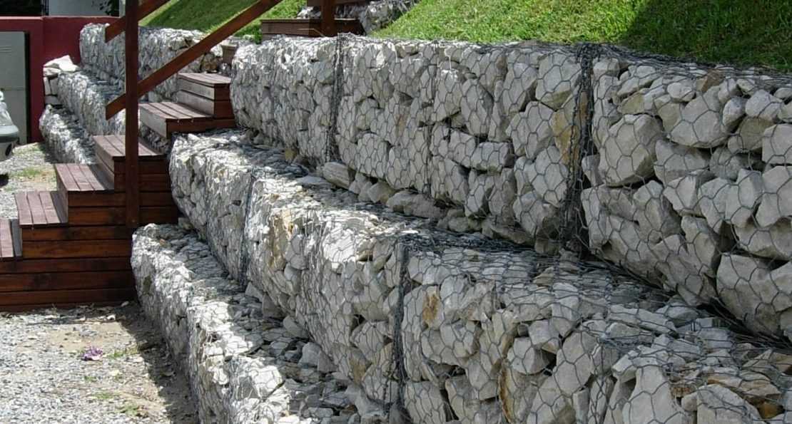 Применяют коробчатые габионы в качестве подпорных стенок на подмываемых склонах, для укрепления дамбы, благоустройства придомовой территории.