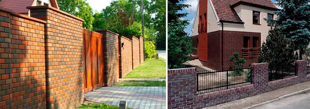 Данный вариант эффективен, надежен. Часто из кирпича выполняют не целый забор, а отдельные элементы, например, столбы. В зависимости от используемого материала, кирпичный забор приобретает разные свойства.