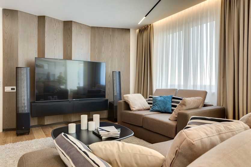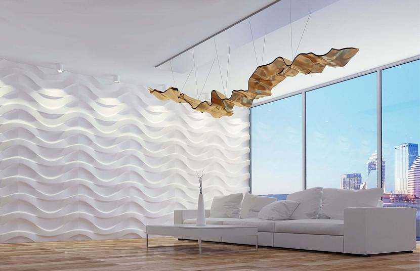 Именно дизайн гостиных чаще всего украшают этим видом отделки. Оригинальным дополнением стеновые панели станут в ТВ-зоне. Особенно интересно смотрятся модели имитирующие волны, поверхность воды или современные геометрические формы.