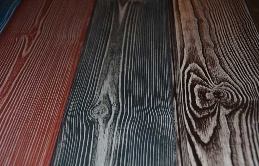 Еще один вариант – использование красок двух контрастных оттенков. Сначала поверхность полностью окрашивается первым цветом, потом наносится второй. Пока второй высыхает, необходимо провести по дереву широким резиновым шпателем, чтобы убрать излишки краски и открыть гребни первого слоя.