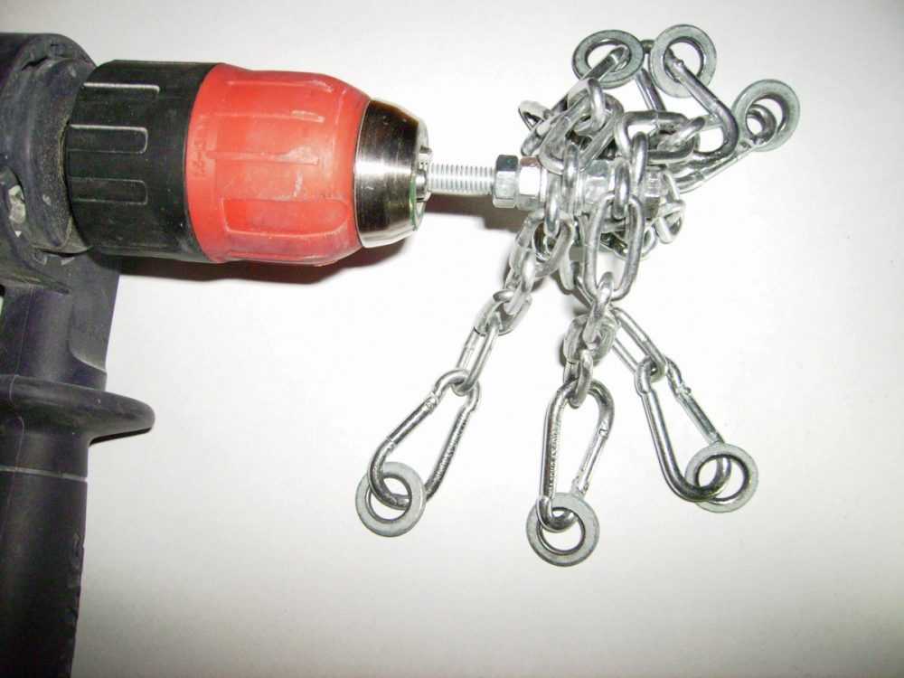- Краскосниматель (представляет собой конструкцию из трех цепей с 13 звеньями в каждой). Положительные моменты работы: краска снимается небольшими кусочками, без образования пыли, слой штукатурки (при его наличии) остается неповрежденным. Относительным недостатком можно назвать то, что цепь во время удаления краски разрушается. Она подлежит обязательной замене, как только с каждой стороны останется по три звена.