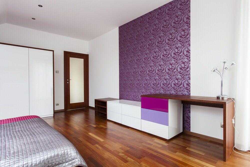 Не останется незамеченными оригинальный интерьер с обоями для спальни, которыми выделили зону у изголовья кровати.
